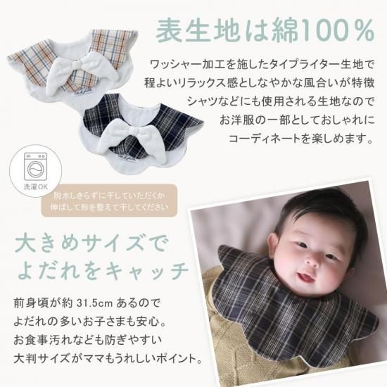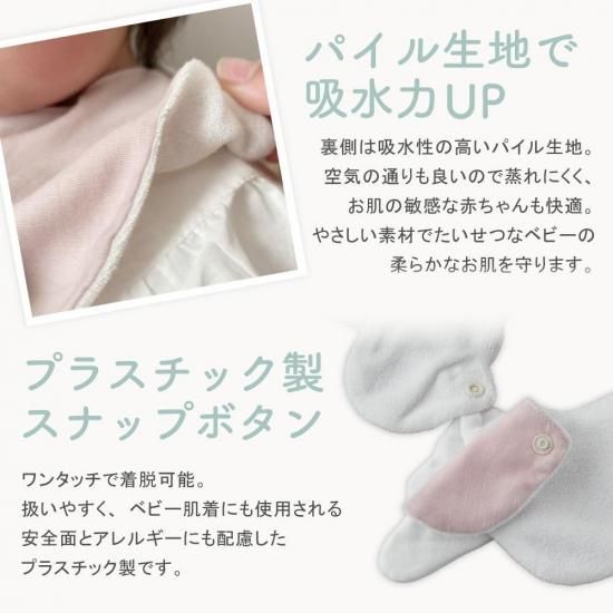 愛らしく可愛いデザインだけでなく、前身頃が大判で広い範囲のよだれカバーが可能。